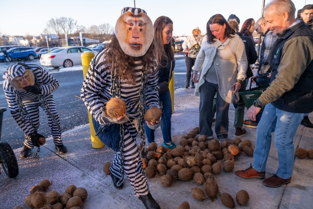 Protestantes miembros de PETA (Personas por el Trato Ético de los Animales) arrojaron carretillas llenas de cocos frente a Whole Foods en South Windsor , en protesta contra la cadena de supermercados que supuestamente vendía leche de coco tailandesa procedente del trabajo de los monos.