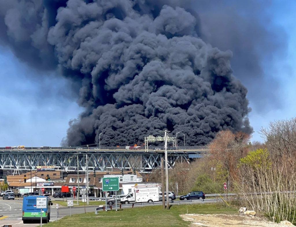 Los videos de la escena mostraron llamas ardiendo y humo saliendo de una sección larga del puente y extendiéndose a una compañía de construcción y marina debajo del lado de Groton.